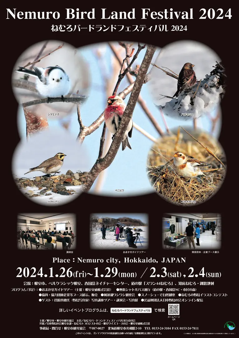 お祭・花火大会 ねむろバードランドフェスティバル 開催日: 2024年1月26日(金) 〜 2024年1月29日(月) / 2024年2月3日(土) 〜 2024年2月4日(日) シェアする 開催日 2024年1月26日(金) 〜 2024年1月29日(月)2024年2月3日(土) 〜 2024年2月4日(日) 会場 【メイン会場】ベルクラシック根室 【サブ開場】春国岱ネイチャーセンター、道の駅「スワン44ねむろ」、根室市民の森 会場住所 〒087-0026 北海道根室市敷島町2丁目9 主催 根室市・根室市観光協会 お問い合わせ先 0153−24−3104 イベント情報の詳細はこちら イベントカレンダーへ