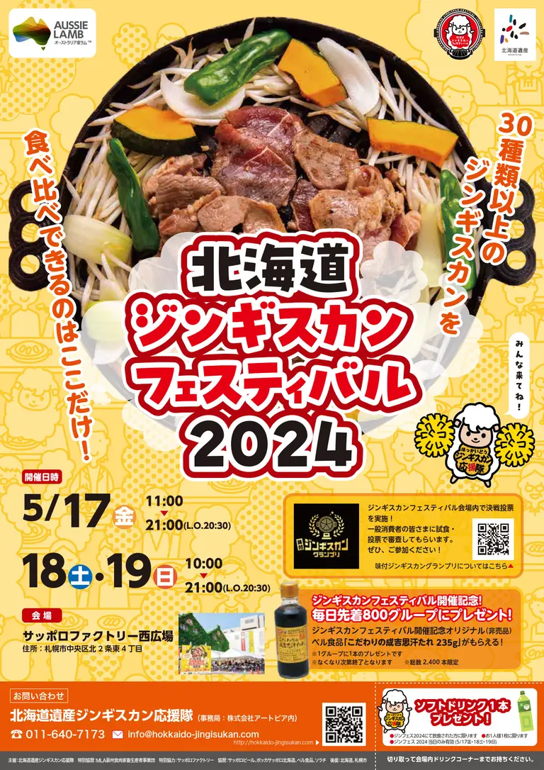北海道遺産ジンギスカン応援隊では、道内各地の「ジンギスカン」の食べ比べが楽しめるイベント「北海道ジンギスカンフェスティバル2024」を、サッポロファクトリー西広場で開催します。