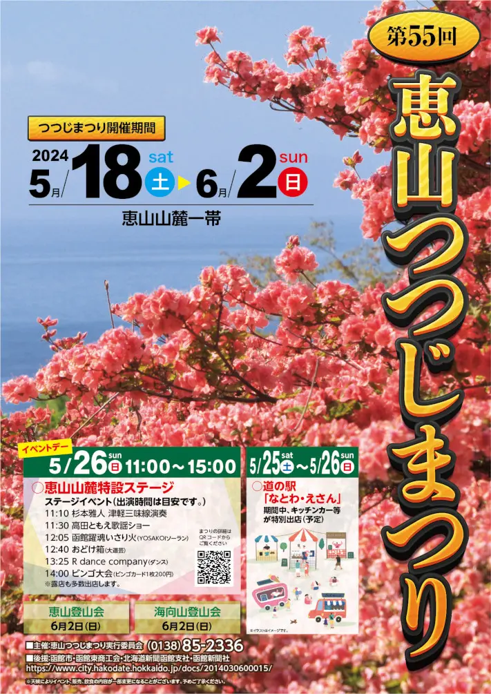お祭・花火大会 恵山つつじまつり 開催日: 2024年5月18日(土) 〜 2024年6月2日(日) シェアする 開催日 2024年5月18日(土) 〜 2024年6月2日(日) 時間 5/26イベントデー 11:00〜15:00 会場 恵山山麓一帯 会場住所 函館市柏野町 主催 恵山つつじまつり実行委員会 お問い合わせ先 函館市恵山支所 産業建設課(TEL:0138-85-2336) イベント情報の詳細はこちら イベントカレンダーへ