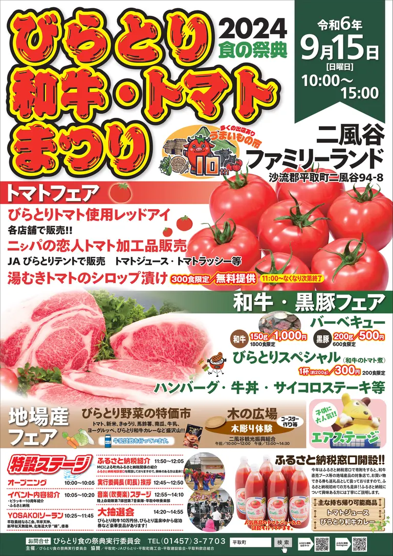 お祭・花火大会 びらとり和牛・トマトまつり 開催日: 2024年9月15日(日) シェアする 開催日 2024年9月15日(日) 時間 10時〜15時 会場 二風谷ファミリーランド 会場住所 北海道沙流郡平取町字二風谷94−8 料金 無料 主催 びらとり食の祭典実行委員会 お問い合わせ先 01457-3-7703 イベント情報の詳細はこちら イベントカレンダーへ