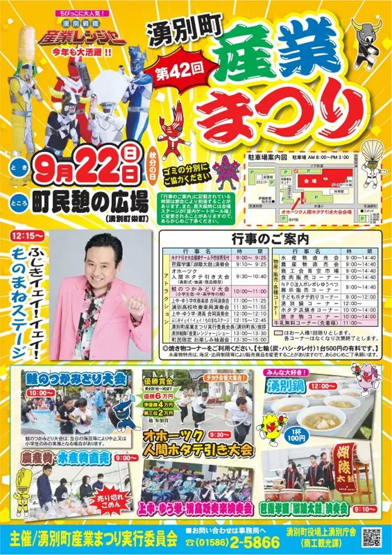 「鮭のつかみどり大会」「オホーツク人間ホタテ引き大会」「産業レンジャーショー」など盛りだくさんのイベントが予定されており、お手頃価格で提供する農産物・水産物の直売や湧別鍋(1杯100円)の販売などもあります。また町内飲食業者による出店もあり、秋の一日を楽しんで下さい。