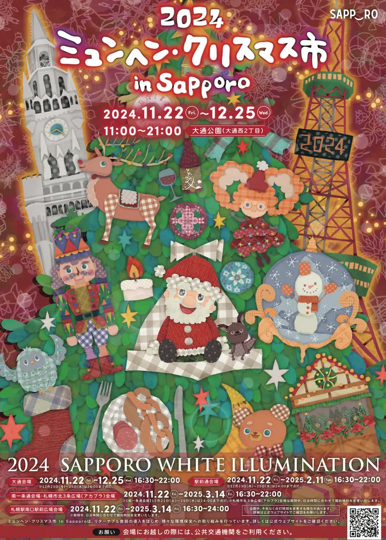 会場となる大通公園西2丁目ではドイツをはじめとする国内外の出店者によるクリスマスグッズ、ドイツ民芸品などの物品、ワイン、ソーセージ、ドイツ菓子などの販売が行われる他、クリスマスムードを盛り上げるステージイベント、ドイツをはじめとする海外の文化を知るイベント等が実施されます!