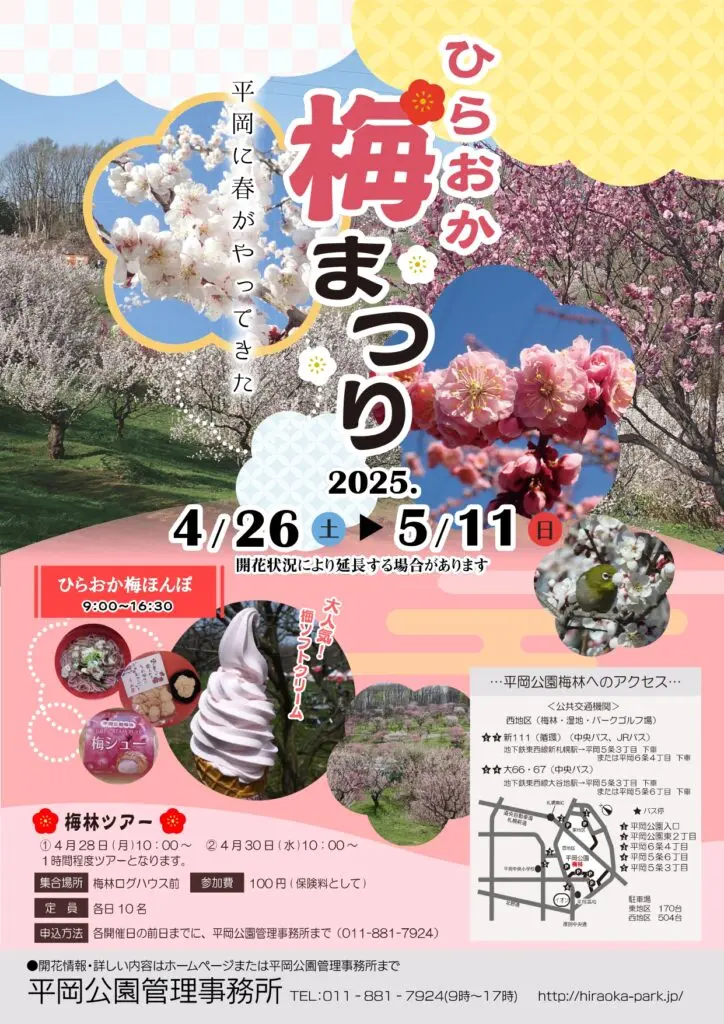 お祭・花火大会 ひらおか梅まつり 開催日: 2025年4月26日(土) 〜 2025年5月11日(日) シェアする 開催日 2025年4月26日(土) 〜 2025年5月11日(日) 時間 24時間 ※公園内の飲食店等の販売時間は9時〜16時半までの予定 ※状況によっては上記時間が変更となる場合がございます。詳細はHPよりご確認下さい。 会場 平岡公園 会場住所 北海道札幌市清田区平岡公園1番地1号 料金 観覧無料 お問い合わせ先 平岡公園管理事務所(011−881−7924) イベント情報の詳細はこちら イベントカレンダーへ