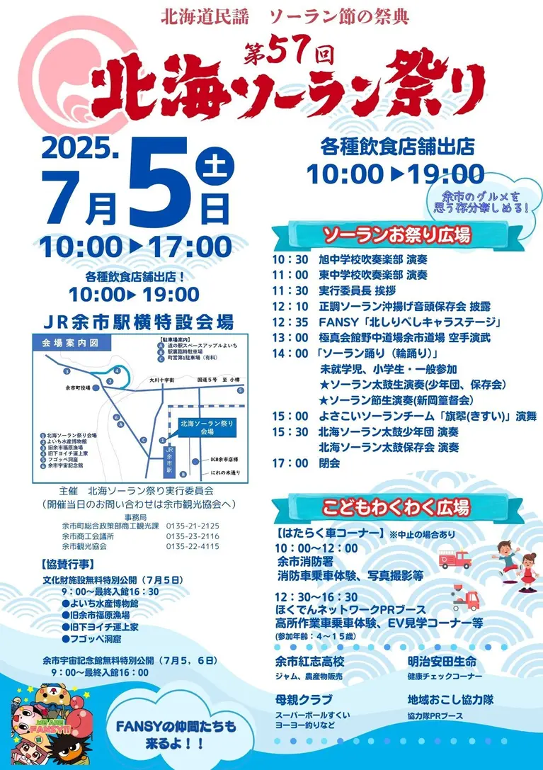 お祭・花火大会 第57回北海ソーラン祭り 開催日: 2025年7月5日(土) シェアする 北海道を代表する民謡「ソーラン節」発祥の地である余市で、「ソーラン節」を後世に伝承していくための夏のお祭りです! 開催日 2025年7月5日(土) 時間 10:00〜17:00 (飲食店舗:10:00〜19:00) 会場 JR余市駅横特別会場 会場住所 余市郡余市町黒川町5丁目 イベントカレンダーへ