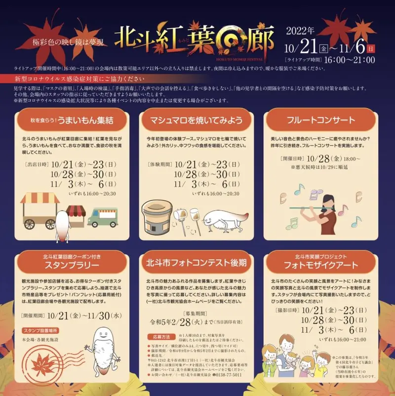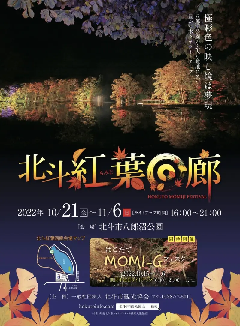 お祭・花火大会 北斗紅葉回廊 開催日: 2022年10月21日(金) 〜 2022年11月6日(日) シェアする 開催日 2022年10月21日(金) 〜 2022年11月6日(日) 時間 (ライトアップ時間)16:00〜21:00 会場 北斗市八郎沼公園 会場住所 北斗市向野132 お問い合わせ先 一般社団法人北斗市観光協会 (電話:0138-77-5011) イベント情報の詳細はこちら イベントカレンダーへ