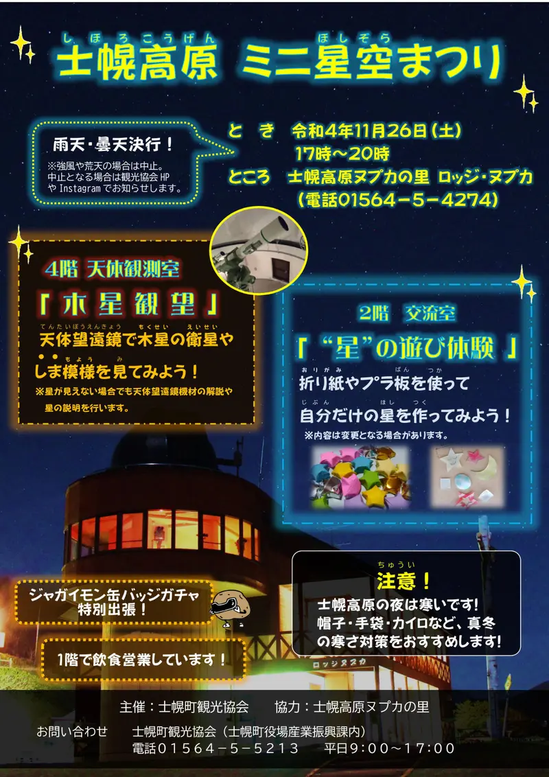 - ※この時期の士幌高原の夜は大変冷え込みます。帽子、手袋、カイロなど真冬の寒さ対策でお越しください。