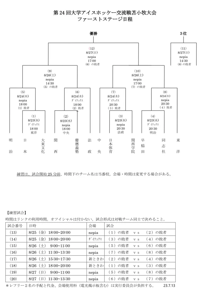 スポーツ 第24回大学アイスホッケー交流苫小牧大会ファーストステージ 開催日: 2023年8月23日(水) 〜 2023年8月27日(日) シェアする 開催日 2023年8月23日(水) 〜 2023年8月27日(日) 時間 23日18:00〜 24日18:00〜 26日14:30〜 27日14:30〜 会場 nepiaアイスアリーナ/ダイナックス沼ノ端アリーナ/新ときわスケートセンター イベント情報の詳細はこちら イベントカレンダーへ