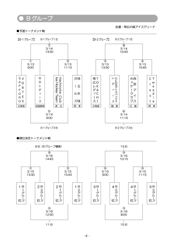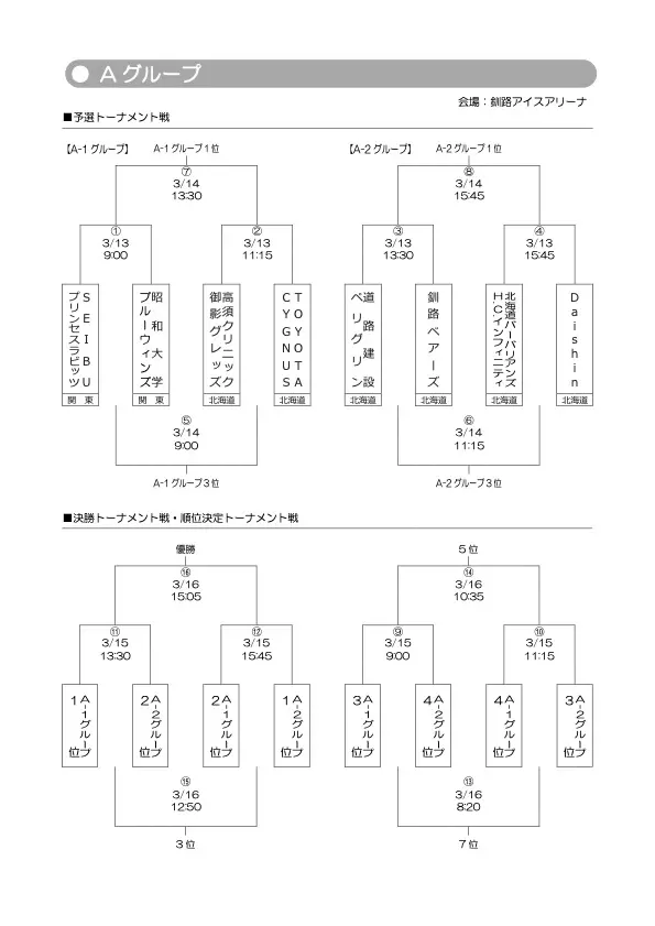 スポーツ 【女子アイスホッケー】第44回全日本女子アイスホッケー選手権大会 開催日: 2025年3月13日(木) 〜 2025年3月16日(日) シェアする Aグループの大会情報はこちら Bグループの大会情報はこちら Cグループの大会情報はこちら 開催日 2025年3月13日(木) 〜 2025年3月16日(日) 時間 9:00〜 会場 Aグループ:釧路アイスアリーナ Bグループ:帯広の森アイスアリーナ Cグループ:帯広の森スポーツセンター 料金 無料 イベントカレンダーへ