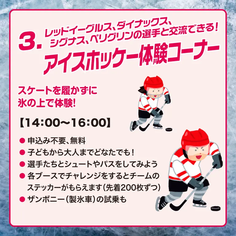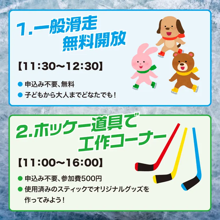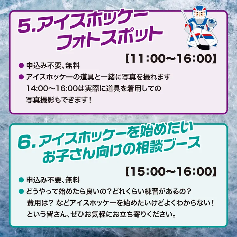 苫小牧市内のアイスホッケーチームによるアイスホッケー体験コーナーや、壊れたスティックを使用した工作コーナーなどどなたでも楽しめる内容が盛りだくさん!