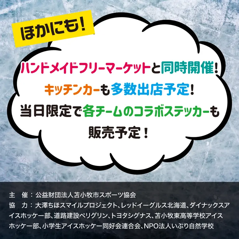 屋外やロビーではフリマ、ハンドメイド、お食事の店舗が多数出店予定でアイスホッケー以外の楽しみも充実しているイベントです。