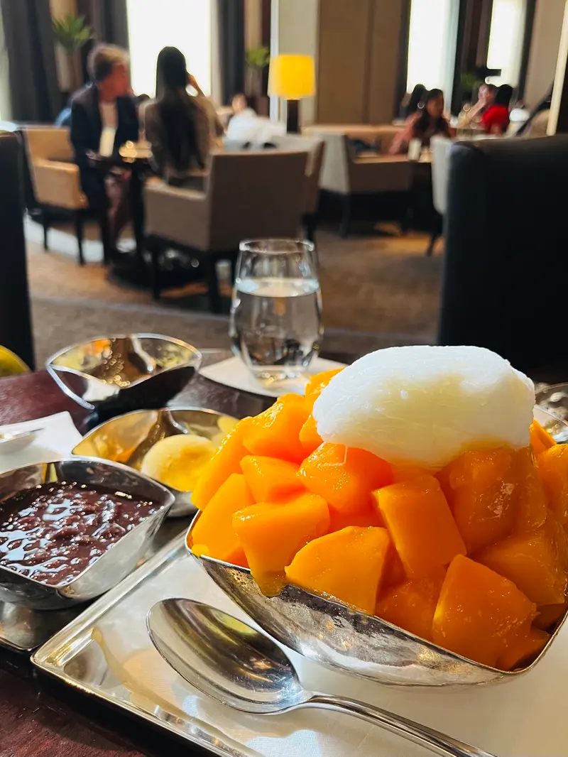 ボウルのような大きな皿に、氷や果物、小豆、アイスクリームなどを高く盛ったピンスは、数人でシェアして食べるのが主流。