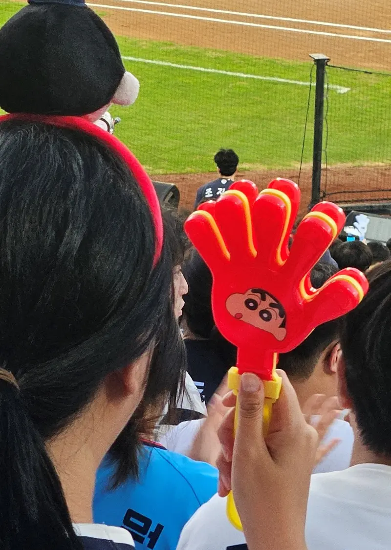 今月、大邱市のサムスンライオンズパークで行われたサムスンライオンズとの試合に行ってみましたが、ロッテのファンが、クレヨンしんちゃんが描かれた鳴り物で盛んに応援していました。