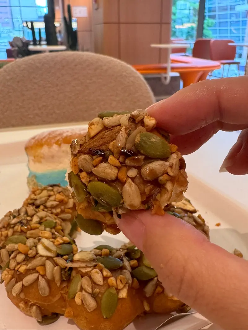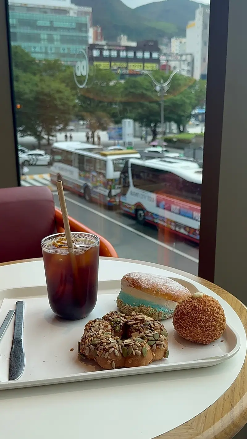 釜山市内でもここだけでしか食べられないドーナツは特別感があり、釜山駅の目の前で2階席からの駅前広場の眺めも特別。