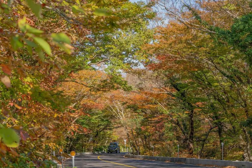 この道は秋になると道の両側に並ぶ木々が赤や黄色に染まり、森のトンネルを形成し、運転している間ずっと秋のロマンを楽しむことができます。