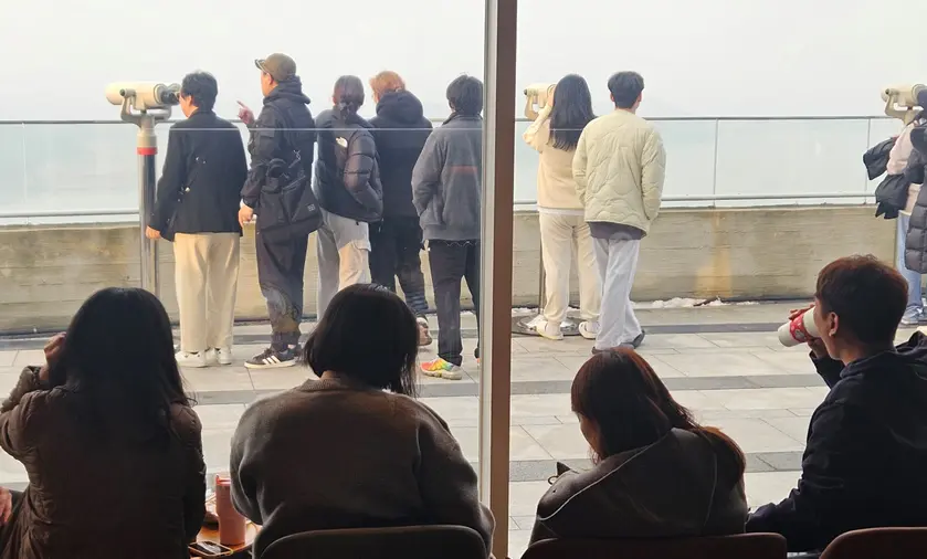 展望台の中には、北朝鮮を一望できるガラス張りのカフェがあります。