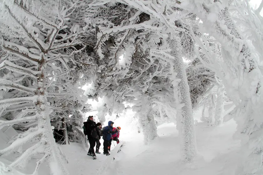 四季折々の山行の趣が異なる漢拏山は、冬になると真っ白な雪に覆われて雪国になります。青い尾根は白い雪原となり、球状樹の枝に咲いた雪の花を眺めながら雪原を歩いていると、まるで空を歩いているような錯覚さえ覚えます。