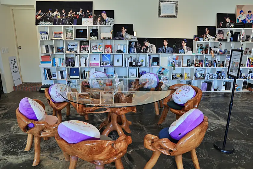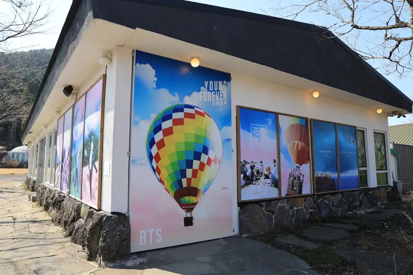 카페 내부에는 실제 촬영에 사용된 열기구를 비롯해 멤버들이 식사했던 테이블과 친필 사인, 사진, 앨범, 굿즈 등이 전시돼 있어 팬들에게 카페 이상의 감동을 전해준다. 바농오름 편백나무 숲길을 품고 있어 시그니처 음료인 ‘7방탄 스페셜(7 BTS special coffee)’과 함께하는 편백숲 산책은 힐링을 선사한다. 카페 주변에는 글램핑과 펜션 시설이 마련돼 있어 밤하늘 별빛 아래에서 BTS의 노래를 들으며 하루를 마무리하는 순간은 그 자체로 추억이 될 것이다.
