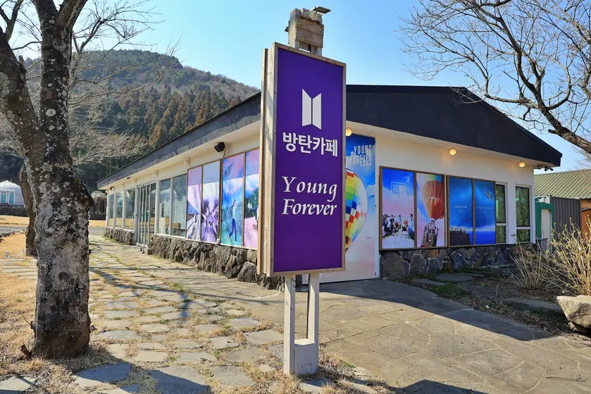 BTS 팬이라면 꼭 한 번 들러야 할 장소 중 하나가 바로 ‘방탄카페 영포에버(Young Forever)’이다. 제주시 조천읍 교래리에 있는 이 카페는 BTS의 스페셜 앨범 《화양연화(Young Forever)》 재킷 화보 촬영지다. 특히 멤버들이 열기구를 탄 장면이 촬영된 장소로 유명하다.