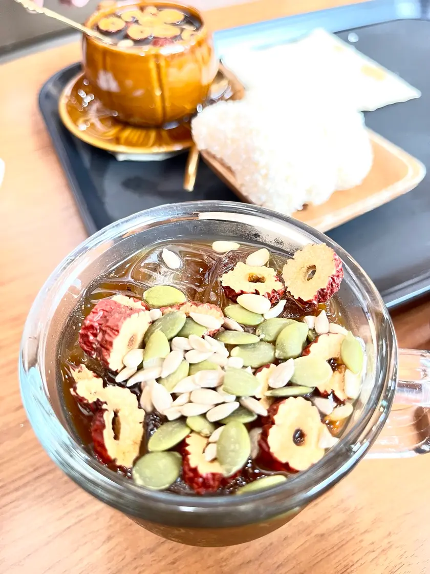 松の実や乾燥させたナツメの果肉が入ったサンファ茶は、メニュー表に「疲労回復」や「肝機能強化」に効用があると書かれていました。韓方の効能をうたうだけあって、少しくせのある味ですが、体が内側から温まってくるような感じで、甘みもあり、おいしかったです。
