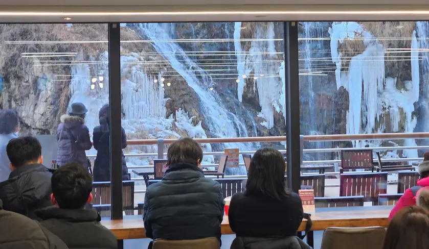 ドーム状の温室で温かくくつろげる席や、滝を目の前に感じられるテラス席、室内のソファー席などがあり、滝を眺めながらコーヒーやお菓子を楽しむことができます。