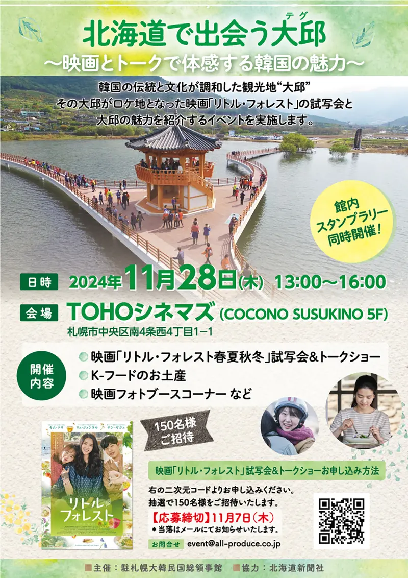 駐札幌大韓民国総領事館は「北海道で出会うシリーズ」として、今年7月に開催された済州島イベントに続く第二弾、「北海道で出会う大邱~映画とトークで体感する大邱」を開催、150名様をご招待いたします。