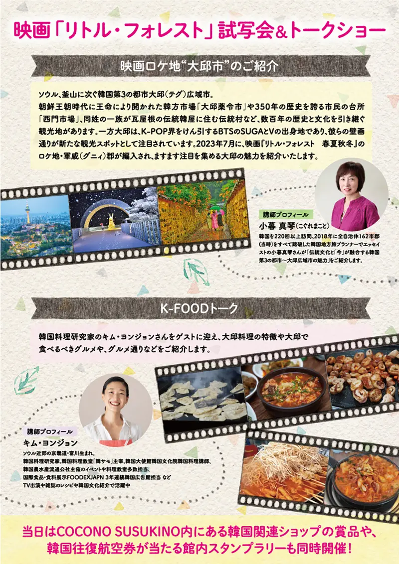今回のイベントでは、大邱を舞台にした韓国映画「リトル・フォレスト春夏秋冬」の試写会と、大邱の魅力をトークで楽しむ内容となっております!