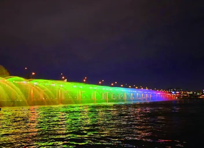ソウルを流れる漢江(ハンガン)にかかる盤浦(バンポ)大橋の月光レインボー噴水ショー!写真や動画で見た方も多いかもしれませんが、地元っ子に大人気のダイナミックな噴水ショーです。今回のツアーでは、地元の人に交じってこのショーを間近で楽しめちゃいますよ!