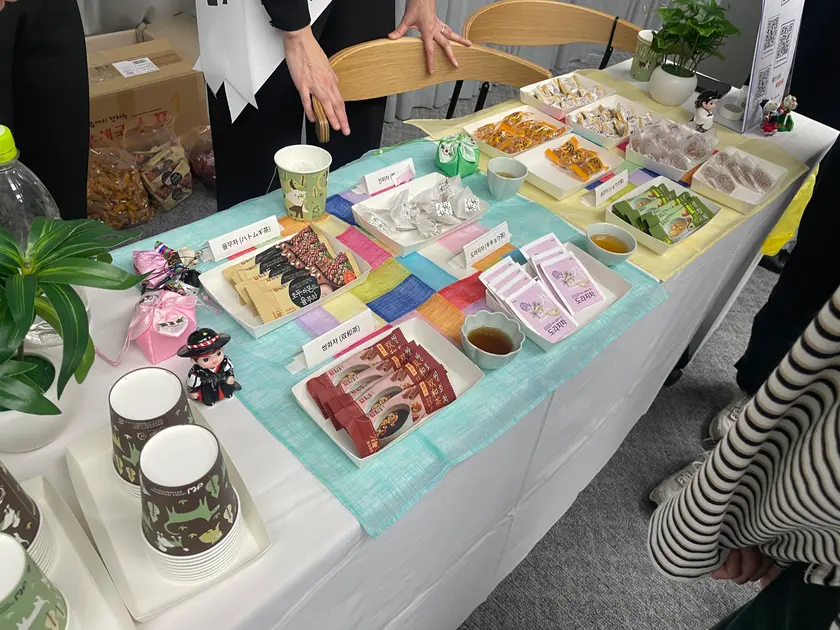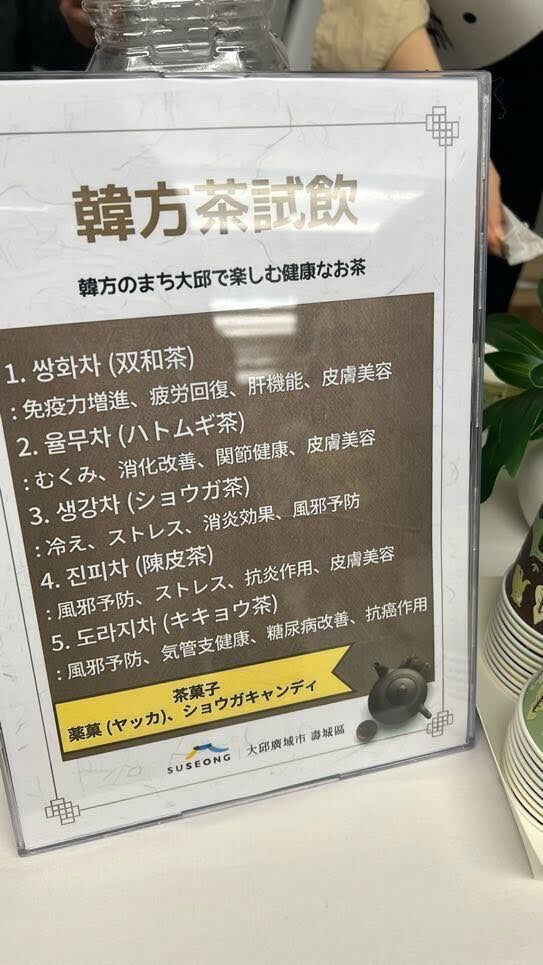 会場内には大邱の観光スポットの展示や、ご自分で味をチョイスできる嬉しい伝統茶の体験、さらには美しい大邱の観光スポットをバックに、チマチョゴリを着ての撮影タイムも。