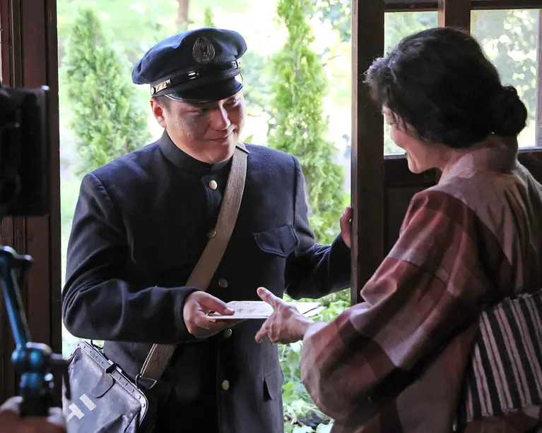 「郵便でーす!」。8月5日に町有形文化財「明治の家」で、紺色の制服に身を包んだ記者は、1通の手紙を俳優島田歌穂さんに手渡した。島田さんは主役テルの叔母役で、「明治の家」はその叔母の自宅という設定だ。「ご苦労さま」と言葉をかけられたら、記者は帽子のつばを少し下げて応じ、次の家に急ぐという演技を求められた。