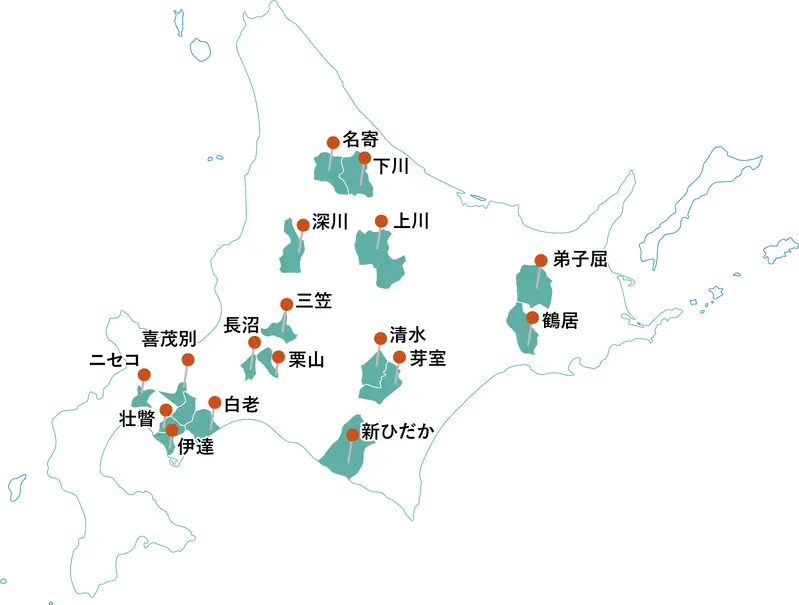 上川町 / 喜茂別町 / 栗山町 / 清水町 / 下川町 / 白老町 / 新ひだか町 / 壮瞥町 / 伊達市 / 鶴居村 / 弟子屈町 / 長沼町 / 名寄市 / ニセコ町 / 深川市 / 三笠市 / 芽室町 / 北海道庁(協力隊・移住)