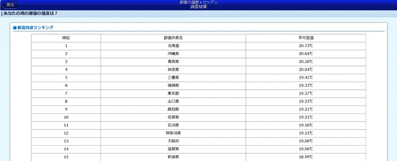 ウエザーニュースが発表している「あなたの県の部屋の温度は?」の調査結果を見ると、北海道は47都道府県で第1位の20.73℃となっています。