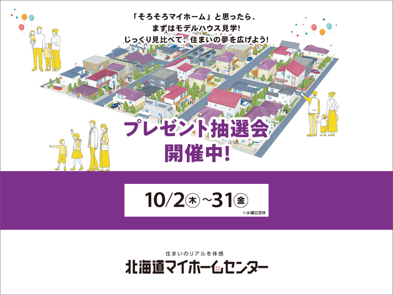 プレゼント抽選会開催! 北海道マイホームセンターでは、「プレゼント抽選会」を開催! モデルハウスの見学時に住まいづくりのご要望やお悩みなどをお気軽にご相談ください。 ◆開催期間 : 8月1日(金)~8月31日(...