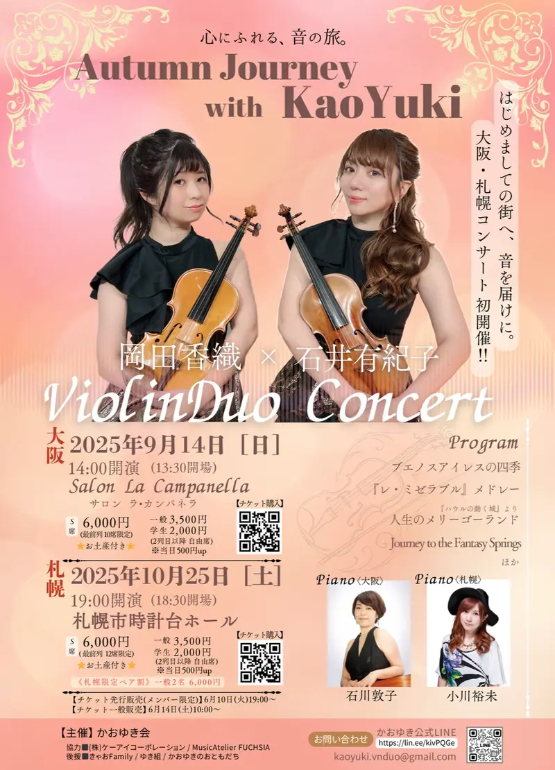福岡を拠点に活動するバイオリンデュオ「かおゆき」が、初の札幌コンサートを開催します。