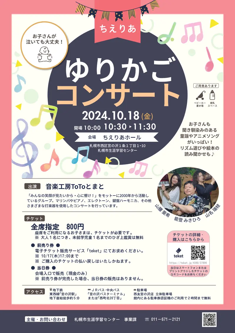 ちえりあのホールで、家族一緒に楽しめるコンサートを行います。