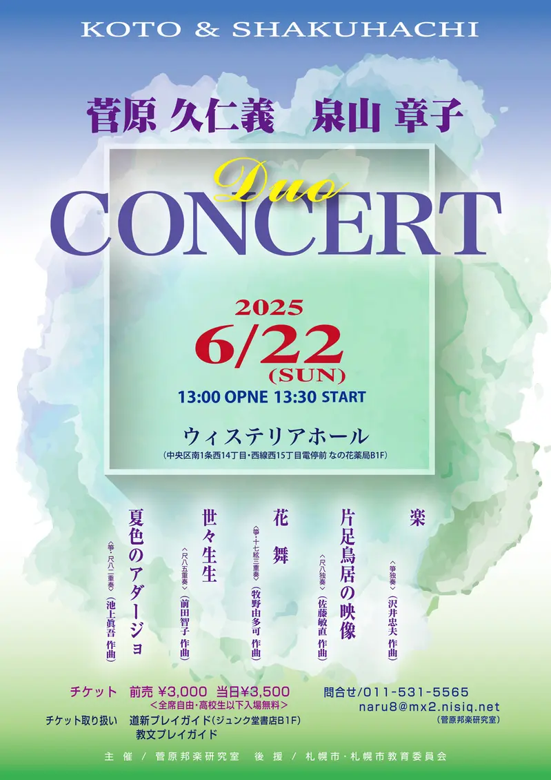 古典芸能・落語 菅原久仁義 / 泉山章子 箏&尺八コンサート 開催日: 2025年6月22日(日) シェアする 箏と尺八による現代邦楽 開催日 2025年6月22日(日) 開演時間 13:30(開場 13:00) 会場 ウィステリアホール チケット料金 前売 ¥3,000 当日 ¥3,500 全席自由・高校生以下入場無料 お問い合わせ先 菅原邦楽研究室TEL : 011-531-5565E-Mail : naru8@mx2.nisiq.net 菅原久仁義/泉山章子 ライブカレンダーへ