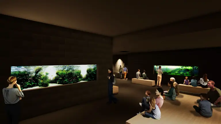 水草が繁茂する美しい水中景観の中で、小さな生物たちの営みを自然の中のありのままの姿で観察することのできる展示です。4つの水景に囲まれた凛とした和の空間の中で、かけがえのない自然の大切さを実感しながら、“生きている水槽”の生態系を間近に観察することができます。