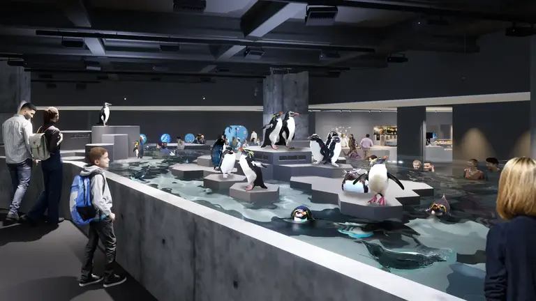 両足で“ホップ”して(飛び跳ねて)移動する習性があるキタイワトビペンギンのダイナミックな行動を間近で観察できる展示です。六角形の展示ブロックを用いた陸場の形状を変化できる世界初の展示システムのなかで生活するペンギンたちと、「人」と「生物」の垣根を超えて、一緒に過ごすことができます。